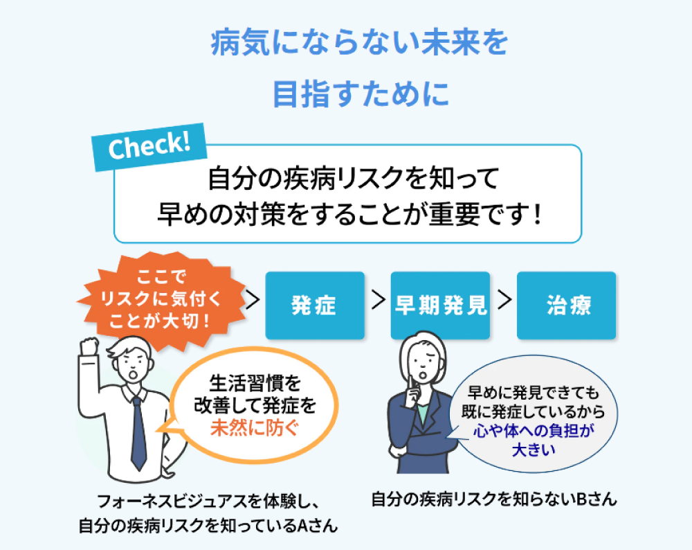 今と将来の疾病リスクを可視化し、一人ひとりに合った生活習慣の改善策を提案・サポートする新時代のトータルヘルスケアサービスです。