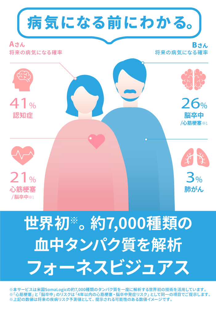 少量の血液を採取し、血液中のたんぱく質を解析することで「将来の疾患予測」と「現在の体の状態」を可視化します。